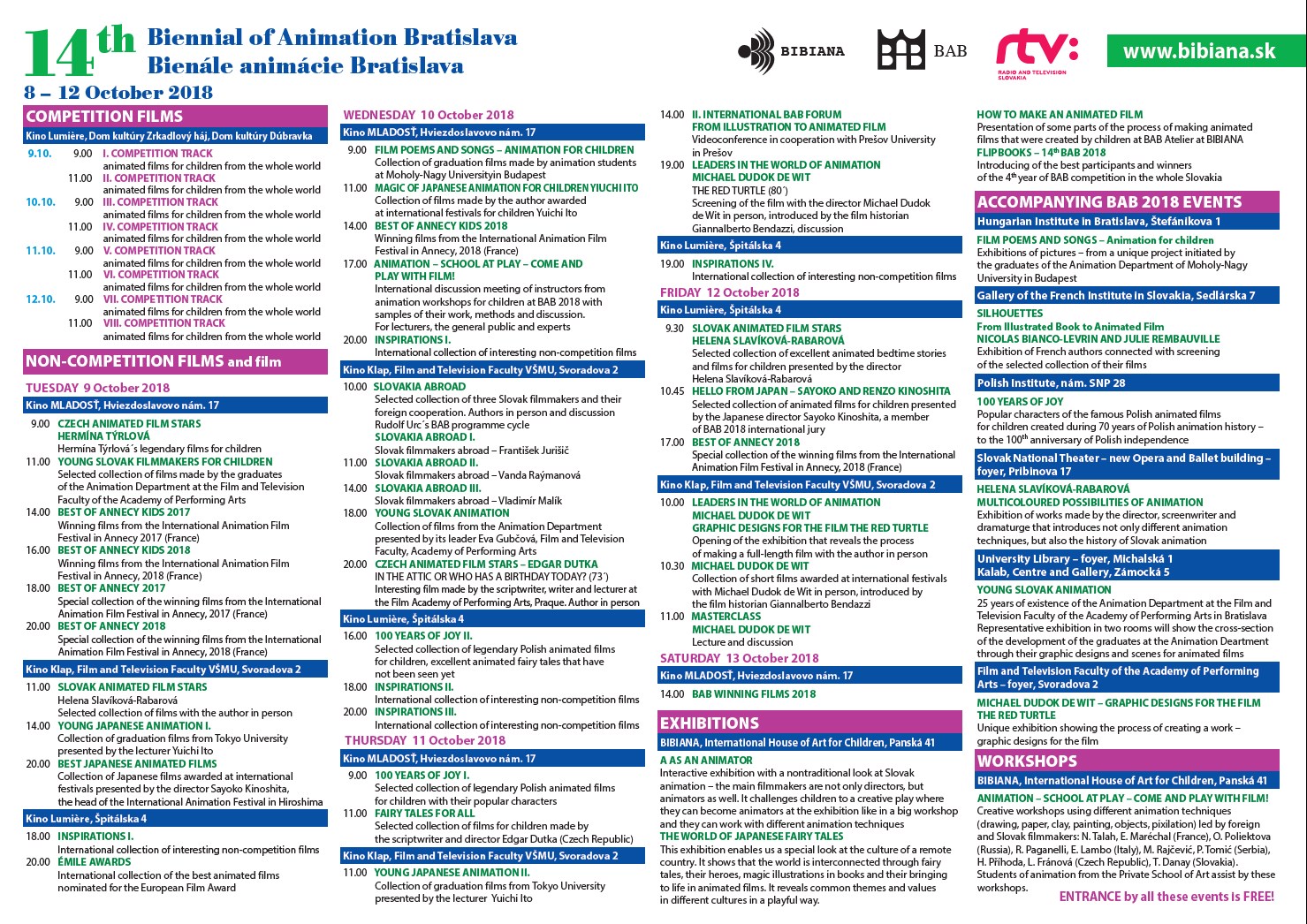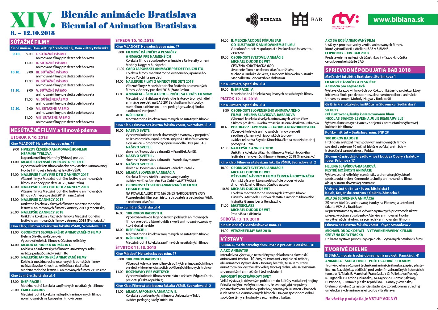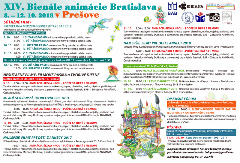 - Súvisiace podujatia:PREDFESTIVALOVÝ ANIMAČNÝ EXPRES -PREŠOV (2018)PREDFESTIVALOVÁ TLAČOVÁ KONFERENCIA BAB 2018 (2018)A AKO ANIMÁTOR (2018, 2019)SVET JAPONSKÝCH ROZPRÁVOK (2018, 2019)OSOBNOSTI SLOVENSKÉHO ANIMOVANÉHO FILMU: HELENA SLAVÍKOVÁ – RABAROVÁ (2018)NAJLEPŠIE JAPONSKÉ ANIMOVANÉ FILMY (2018)NAŠI VO SVETE (2018)OCENENÍ AUTORI NA BIB 2017 - Prievidza (2018)POĎTE SA HRAŤ S FILMOM! – ANIMÁCIA-ŠKOLA HROU na BAB 2018 (2018)MLADÁ SLOVENSKÁ ANIMÁCIA - 25 ROKOV ATELIÉRU ANIMOVANEJ TVORBY NA FILMOVEJ A TELEVÍZNEJ FAKULTE VŠMU V BRATISLAVE (2018)FILMOVÉ BÁSNIČKY A PESNIČKY, Animácia pre najmenších (2018)FLIPBOOKY – XIV. BAB 2018 (2018)SILUETY, OD ILUSTROVANEJ KNIHY K ANIMOVANÉMU FILMU - NICOLAS BIANCO-LEVRIN & JULIE REMBAUVILLE (2018)100 ROKOV RADOSTI (2018)AKO SA ROBÍ ANIMOVANÝ FILM (2018)TLAČOVÁ KONFERENCIA PRI PRÍLEŽITOSTI OTVORENIA 14. ROČNÍKA BIENÁLE ANIMÁCIE BRATISLAVA - BAB 2018 - V BIBIANE (2018)II. MEDZINÁRODNÉ FÓRUM BAB - OD ILUSTRÁCIE K ANIMOVANÉMU FILMU (2018)POĎTE SA HRAŤ S FILMOM! – ANIMÁCIA - ŠKOLA HROU (2018)HVIEZDY SVETOVÉHO ANIMOVANÉHO FILMU – MICHAEL DUDOK DE WIT (2018)