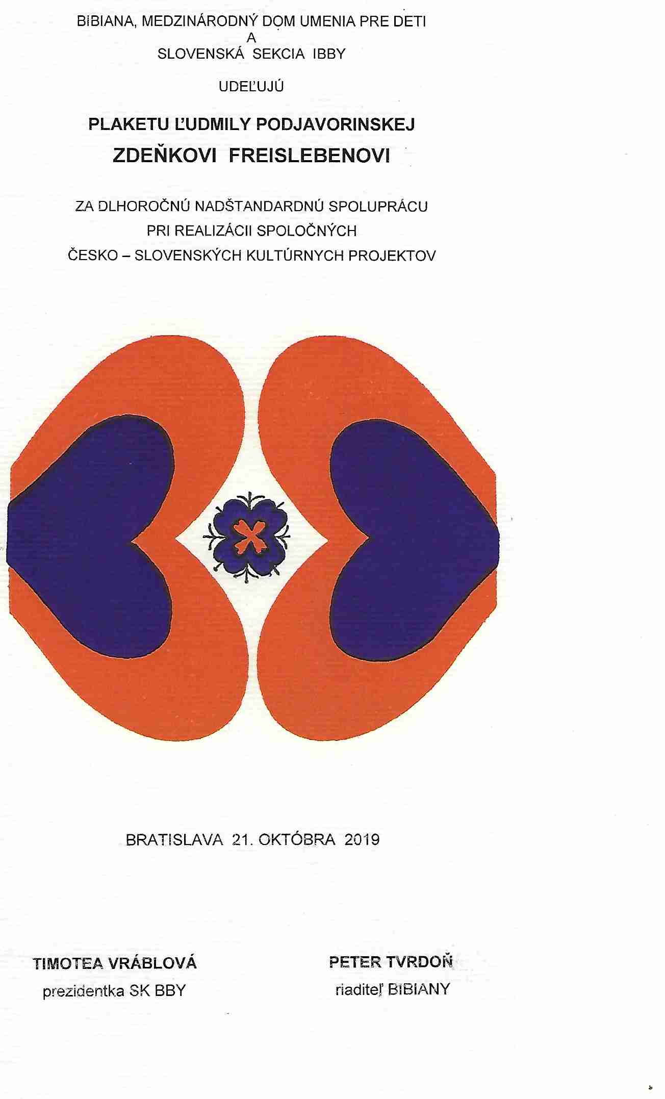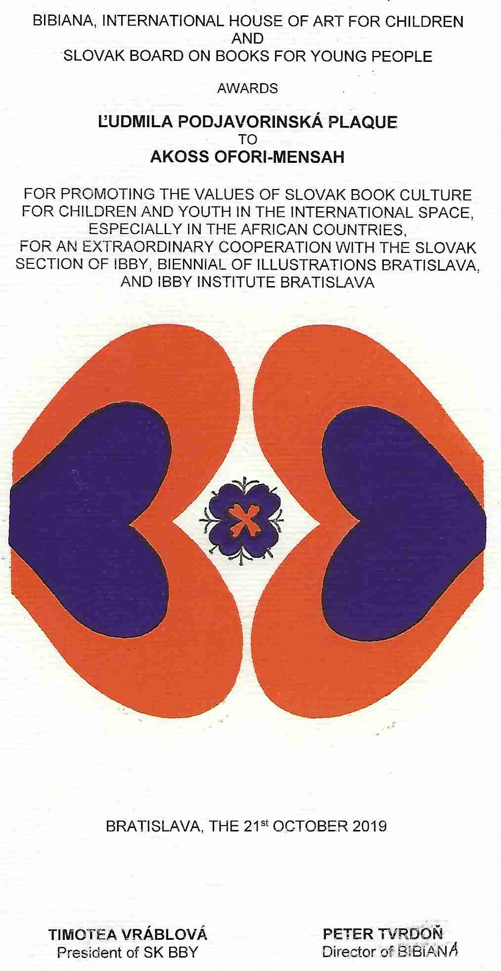 Plaketa Ľudmily Podjavorinskej je ocenením našim a zahraničným jednotlivcom, kolektívom alebo inštitúciám, ktorí sa významne zaslúžili o šírenie slovenskej detskej literatúry v zahraničí. BIBIANA, medzinárodný dom umenia pre deti a Slovenská sekcia IBBY udelili ocenenie Akoss Ofori-Mensah a Zdeňkovi Freislebenovi za intenzívnu spoluprácu s BIBIANOU a za prehlbovanie vzájomných kontaktov a za vynikajúcu spoluprácu s Bienále ilustrácií Bratislava, Slovenskou sekciou IBBY a významnú propagáciu slovenských kníh pre deti v zahraničí. Slávnostné udeľovanie ocenenia sa uskutočnilo počas Hudobného salónu u Zichyovcov v Zichyho paláci.